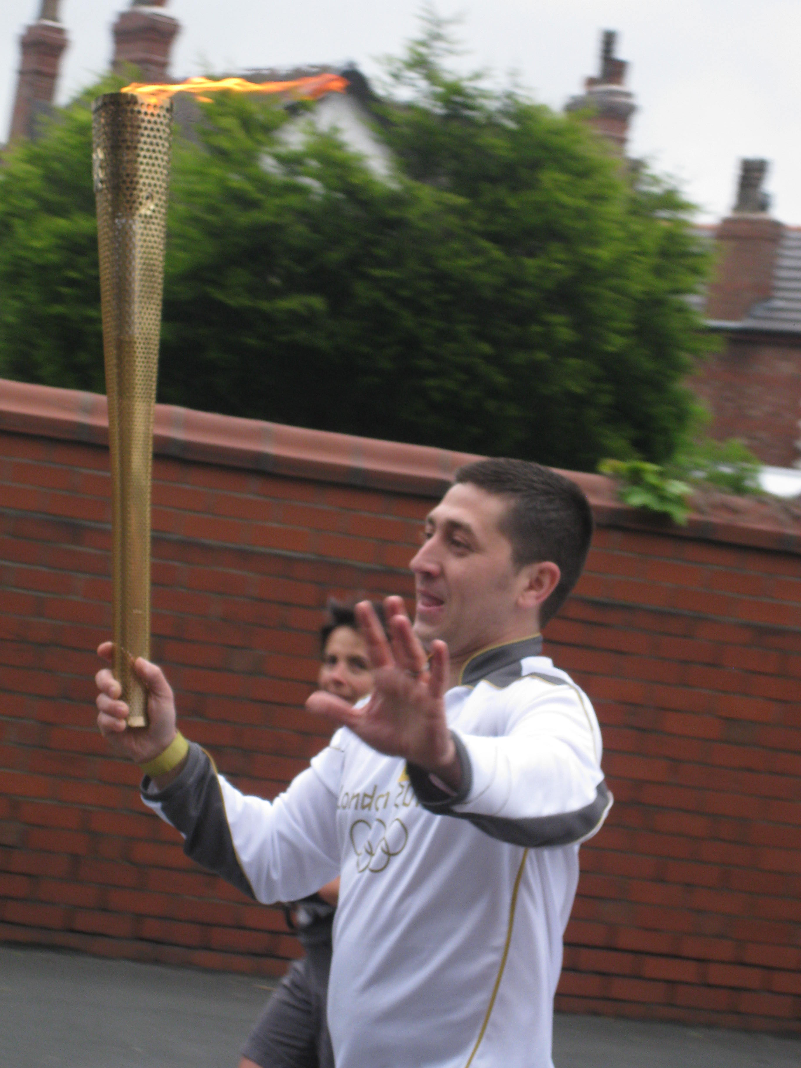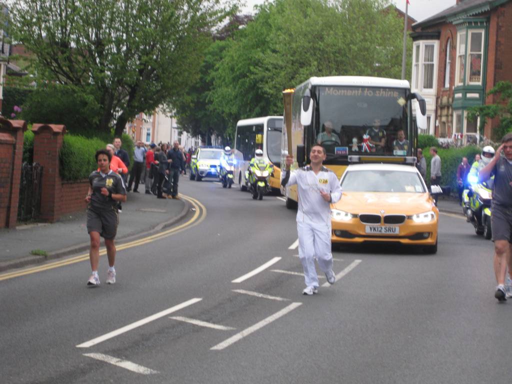 I managed to squeeze out a few shots, but quite frankly should have done better (as you’ll see from the evidence). Either way, it was all over far too quickly and Ian was soon back on the official bus after a few celebratory family hugs, with Helen already away into the distance towards a town mis-pronounced ‘Yookston’ by generations of badly-informed broadcasters. You can’t level that at Radio Lancs though, who were definitely on the ball and by that stage had stand-up comic, jogging juggler and all-round good bloke Steve Royle running after torch-bearers looking for would-be interviewees.