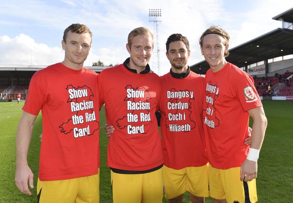 Clear Message: Woking’s Mark Ricketts, Scott Rendell, Giuseppe Sole and Will Salmon spell it out at Wrexham (Photo: David Holmes)