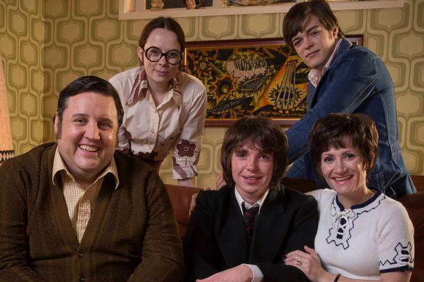 Baker Bunch: Danny Baker’s fictional family in Cradle to Grave, for which Squeeze wrote the music. Top row – Alice Sykes and Frankie Wilson. Front row – Peter Kay, Laurie Kynaston, Lucy Speed (Photo: BBC).