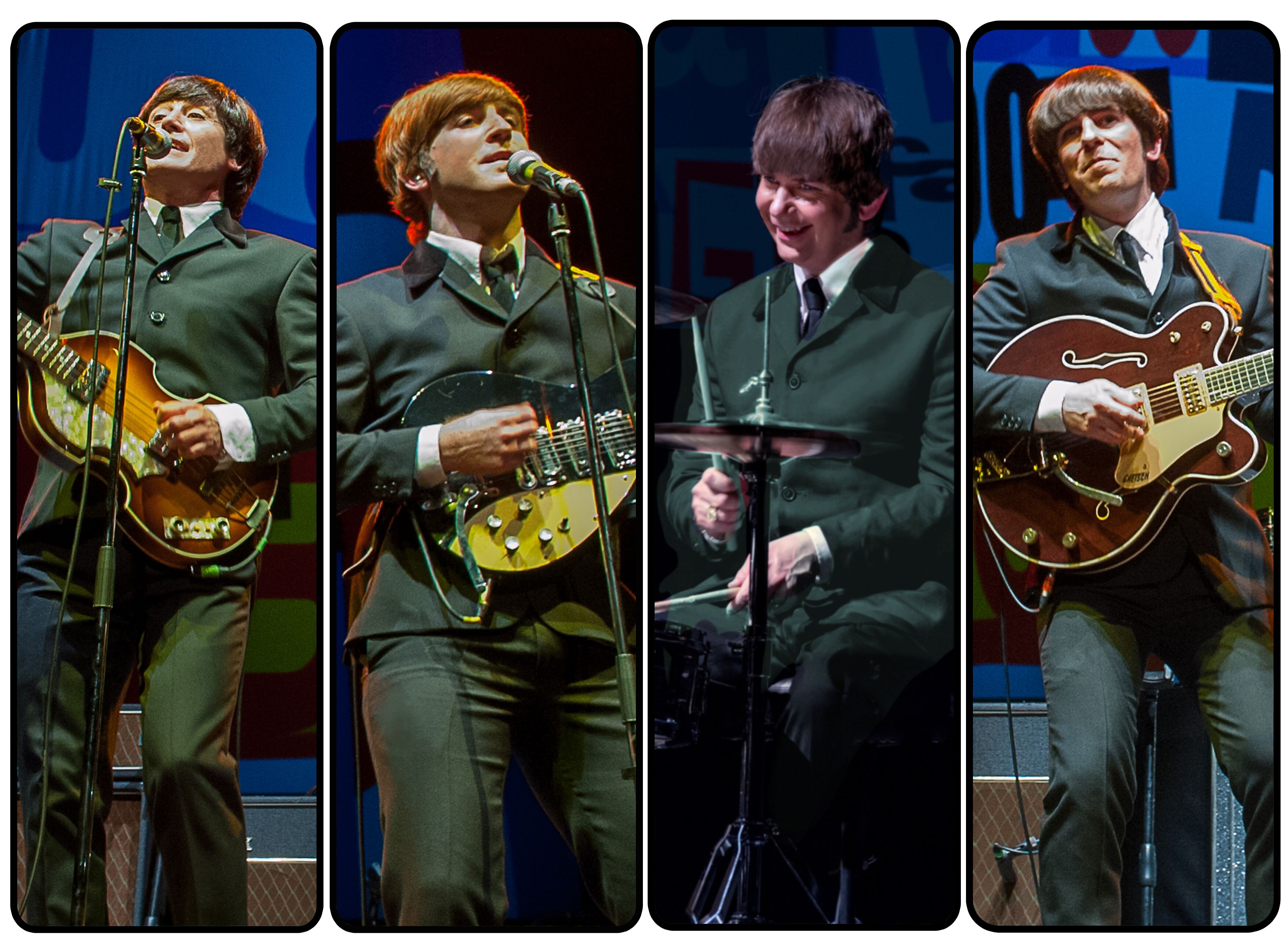 Mop Tops: Twisting and shouting, Bootleg Beatles style – From the left – Steve White (Paul), Stephen Hill (George), Gordon Elsmore (Ringo), and Adam Hastings (John).