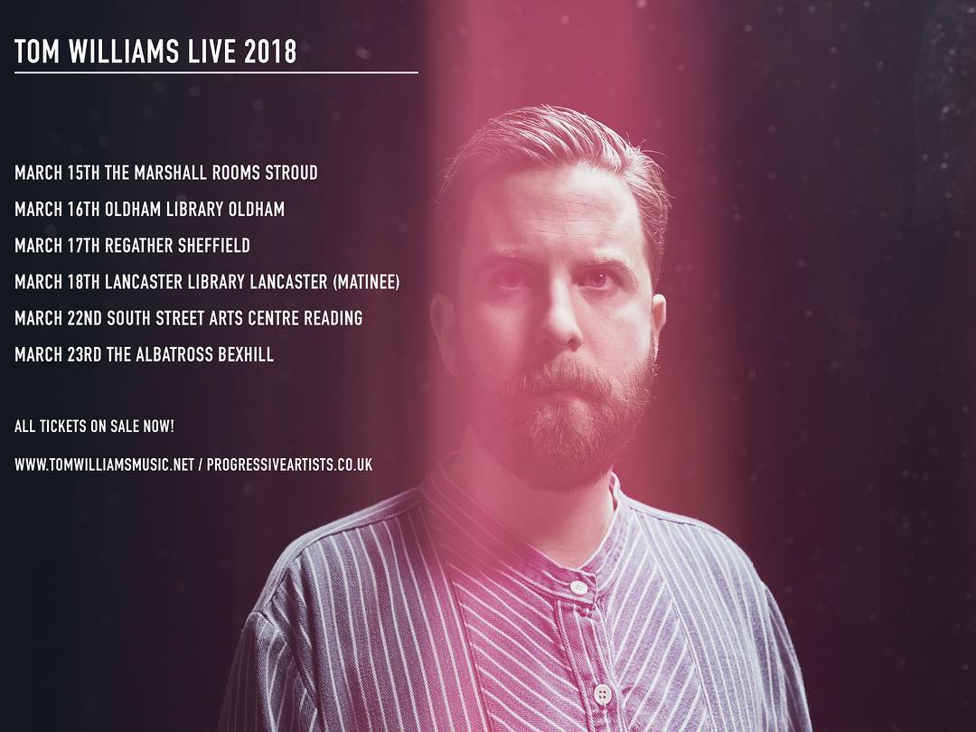 Tom Williams and his band visit Stroud’s Marshall Rooms (Thursday, March 15th), Oldham Library & Lifelong Learning Centre (Friday, March 16th), Sheffield Regather (Saturday, March 17th), Lancaster Library (Sunday, March 18th, 2.30pm), Reading’s South Street Arts Centre (Thursday, March 22nd), and Bexhill’s Albatross Club (Friday, March 23rd, already sold out). For ticket details and all the latest from Tom, head to his official website here. You can also keep in touch via Facebook, Instagram and Twitter.