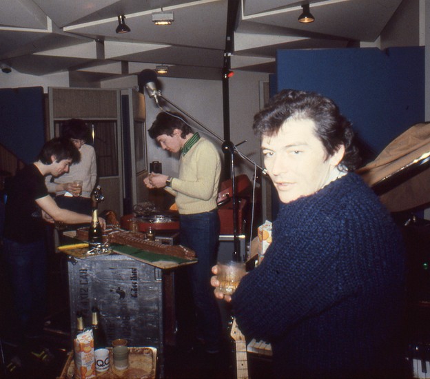 Stiff Competition: Rare pic of Jake Riviera visiting to wish Damian a happy birthday at Eden Studios in early 1980 (Photo from Roger Bechirian’s collection via Pete Weiss for the https://tapeop.com website)