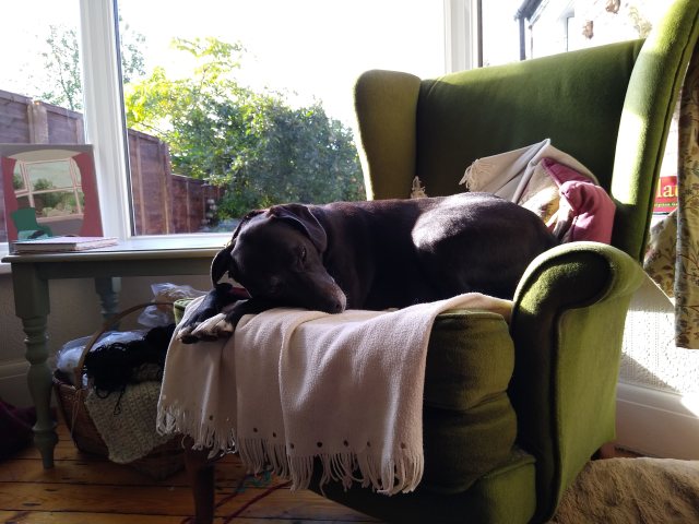 The previous night, a similar tale, but we at least got some exercise in. I threw hotdog on to an armchair, she jumped up and retrieved. I threw the next bit by the living room door. She charged through, click and collect style. I moved to the foot of the stairs, threw the sausage up towards Andrew the chicken (don’t ask) at the top by the stained-glass window. She clambered up and wolfed it down. You get the picture. We got two-thirds of the way down the cup before she’d had enough and burrowed back into the sofa. I needed a sit down and a wheeze by then.