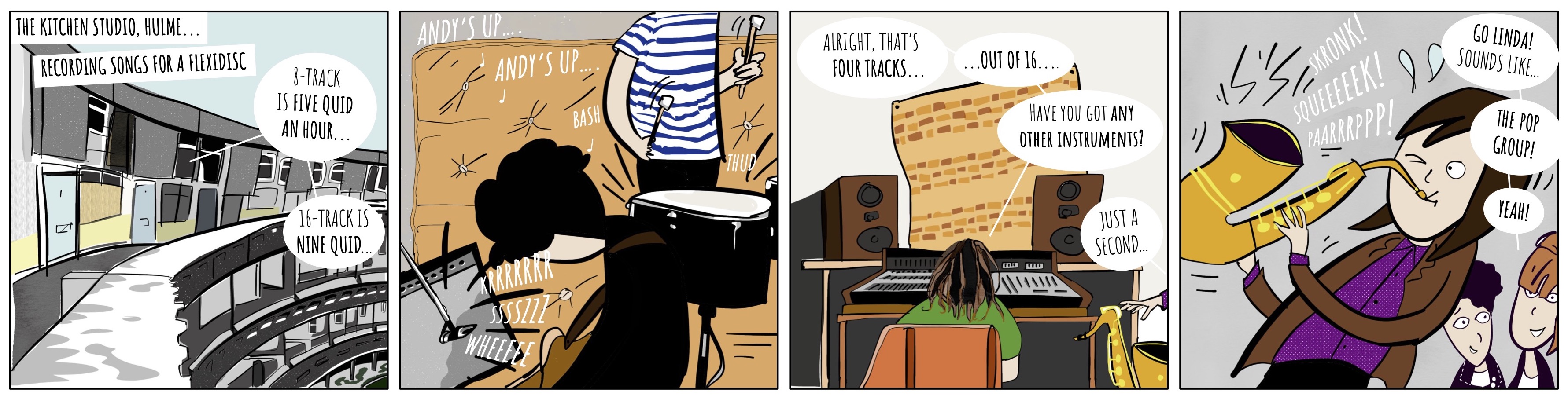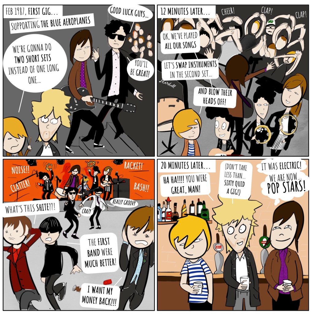 I was intrigued by that Gerard Langley link, not least as the frontman of The Blue Aeroplanes – and past WriteWyattUK interviewee – also gets a mention on mammoth LP closer ‘Alice’s Paper Plane’. And it turns out, their first gig was with the cherished Bristol outfit, as depicted in Simon Beecroft’s splendid comic strip creation telling their story (far better than I can, probably) up to the time Karrie Price joined the band.