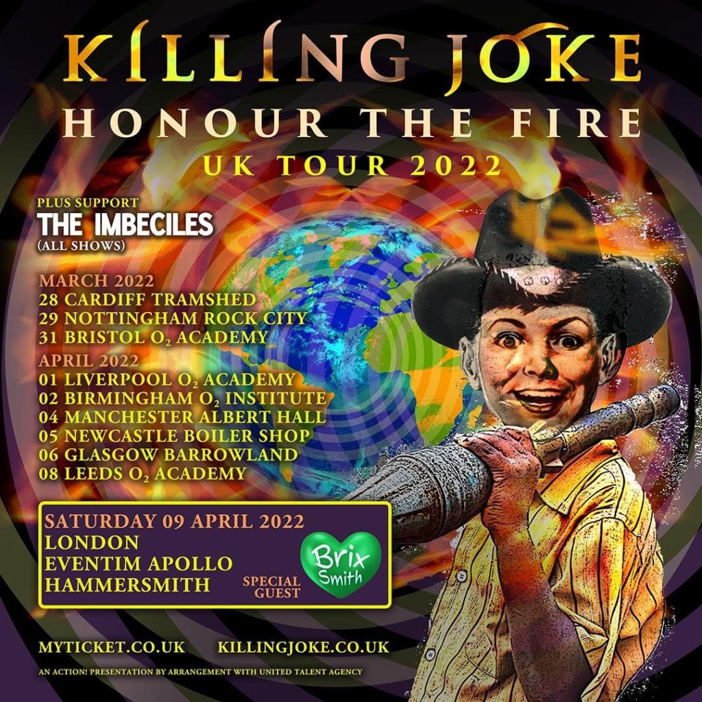 The Honour the Fire UK tour, with The Imbeciles supporting on all dates except Cheltenham, and Brix Smith a special guest in London: March: Sunday 27th – Cheltenham Frog & Fiddle; Monday 28th – Cardiff Tramshed; Tuesday 29th – Nottingham Rock City; Thursday 31st – Bristol O2 Academy. April: Friday 1st – Liverpool O2 Academy; Saturday 2nd – Birmingham O2 Institute; Monday 4th – Manchester Albert Hall; Tuesday 5th – Newcastle Boiler Shop; Wednesday 6th – Glasgow Barrowland; Friday 8th – Leeds O2 Academy; Saturday 9th –Hammersmith Eventim Apollo. Tickets are available via www.myticket.co.uk. For more on Killing Joke, check out their official website and Facebook page.