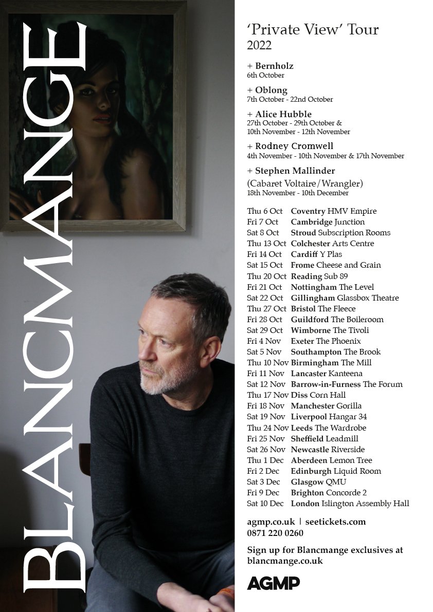 Private View UK tour: October – 1st, Rough Trade East, London; 7th, The Junction, Cambridge – w/ Oblong; 8th, Subscription Rooms, Stroud – w/ Oblong; 13th – Arts Centre, Colchester – w/ Oblong; 14th – University Y Plas, Cardiff – w/ Oblong; 15th – Cheese and Grain, Frome – w/ Oblong; 20th – Sub 89, Reading – w/ Oblong; 21st – The Level, Nottingham – w/ Oblong; 22nd – Glassbox Theatre, Gillingham – w/ Oblong; 27th – The Fleece, Bristol – w/ Alice Hubble; 28th – The Boileroom, Guildford – w/ Alice Hubble; 29th – Tivoli Theatre, Wimborne – w/ Alice Hubble. November – 4th – Exeter Theatre, Exeter – w/ Rodney Cromwell; 5th – The Brook, Southampton – w/ Rodney Cromwell; 10th – The Mill, Birmingham – w/ Alice Hubble; 11th – Kanteena, Lancaster – w/ Alice Hubble; 12th – The Forum Theatre, Barrow-in-Furness – w/ Alice Hubble; 17th – Corn Hall, Diss – w/ Rodney Cromwell; 18th – Gorilla, Manchester – w/ Stephen Mallinder; 19th – Hangar 34, Liverpool – w/ Stephen Mallinder; 24th – The Wardrobe, Leeds – w/ Stephen Mallinder; 25th – The Leadmill, Sheffield – w/ Stephen Mallinder; 26th – The Riverside, Newcastle – w/ Stephen Mallinder. December – 1st – The Lemon Tree, Aberdeen – w/ Stephen Mallinder; 2nd – The Liquid Room, Edinburgh – w/ Stephen Mallinder; 3rd – Queen Margaret Union, Glasgow – w/ Stephen Mallinder; 9th – Concorde 2, Brighton – w/ Stephen Mallinder; 10th – Islington Assembly Hall, London – w/ Stephen Mallinder.