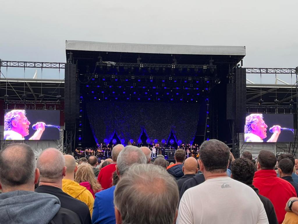The whole ensemble started with Tommy’s scene-setting ’Overture’ (hang on, am I at a prog rock show?), tantalising hints at what was coming next all there, Pete in his element in this ‘slow burner’ opening, the tone neatly taken on through ‘1921’ (‘what about the boy?’ – well, turns out that Roger’s voice is still very much there, all these years on) and ‘Amazing Journey’ before band and orchestra alike showed true rocking out propensities on ‘Sparks’, ‘The Acid Queen’ then leading us on to the punching riffery of ‘Pinball Wizard’, the audience fully warmed up, albeit still with plenty of skyward glances, rainfall seemingly never far off for those of us out on the pitch.