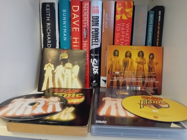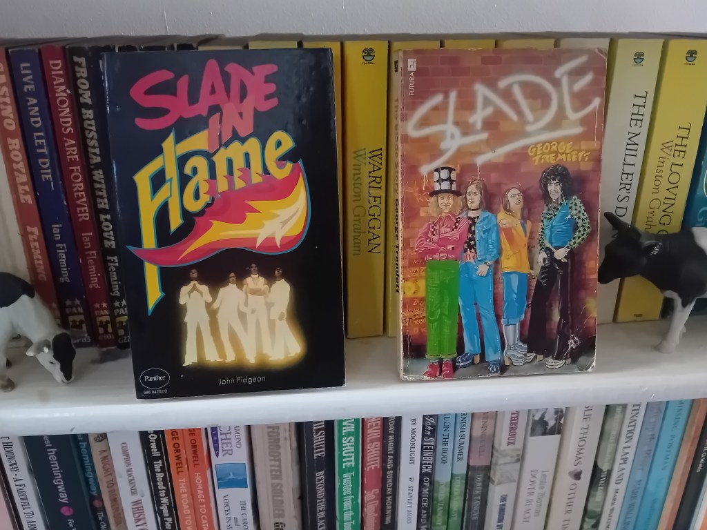 My copy of John Pidgeon’s Slade in Flame book (Panther, 1975) still sits proudly alongside George Tremlett’s The Slade Story (Futura, 1975) on a shelf. My brother, seven years older and a massive Slade fan, had both on release, but photos had been cut out and I ended up buying my own copies in more recent years. I knew The Slade Story well, but can’t recall going back to Pidgeon’s paperback so much beyond my teen years, when its fairly graphic nature (if I remember correctly) appealed more.